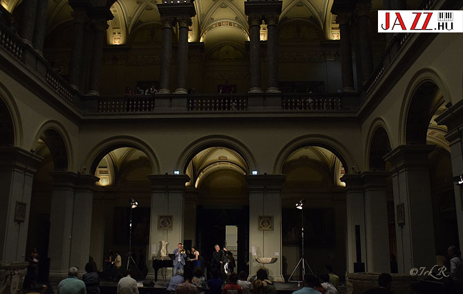 Következő állomás a szomszédban lévő Szépművészeti Múzeum volt, ahol ijesztően hosszú sor hömpölygött az utcán, de szerencsére az oldalkapun beslisszanhattam csak a jazzkoncertre, a Reneszánsz Csarnokba, ahol a Fine Arts Jazz Group játszott Skerlecz Gábor harsonás vezetésével, akiknek a vendége a fiatal tehetséges énekesnő, Nagy Noémi volt, akivel nemrég készült interjú itt a szakportálon. Egész hangorkán fogadott a nagy belmagasságú, gyönyörű teremben, a hangok csak úgy pattogtak ide-oda. Egy fiatal pár mellettem megjegyezte, mintha templomban hallgatnánk a zenét.