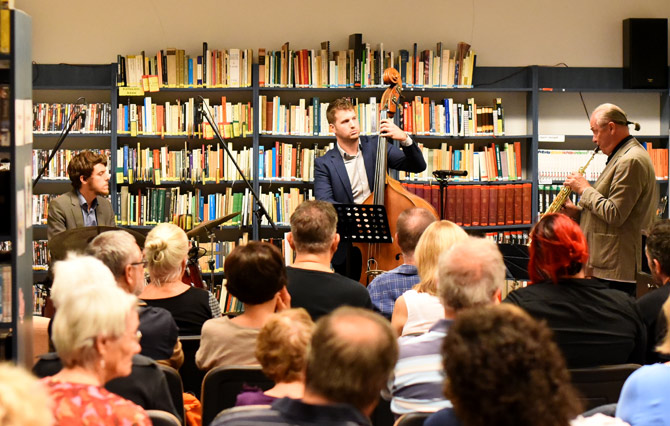 Csütörtökön Elek István Érdre összeállított triója folytatta a fesztivált a zenei könyvtárban. Feltörekvő zenészeket hozott magával, akik még csak idén fogják elvégezni az egyetemet, de játékukon valami pluszt lehet már most hallani. Elek István egyik legkedveltebb szaxofonosom, mestere a hangszerének. Amilyen lágyan néha, ugyanolyan erővel fújja máskor az alt és szoprán szaxofonokat, kifinomult technikával adja elő mindig a standardeket vagy saját szerzeményeit. Ezen az estén a ritmusszekciót Arday Dániel és Márkosi András alkották. Úgy emlékszem, még nem hallottam Elek Istvánt ilyen formációban játszani, tehát a harmóniahangszer, a zongora nélkül. Nagyon jól szóltak a dalok. Arday Dániel bőgőjének egy csodaszép mély soundja van, jó hallgatni, ahogy játszik rajta Dani. Márkosi András pedig egy óriási tehetség, a swing dobolás ifjú titánja. Már három éve figyelem, és mindig a háttérben marad, mégis kitűnik a dobtechnikájával, olyan magától értetődőnek tűnik a dobolása, mégis bemászik a fülekbe.